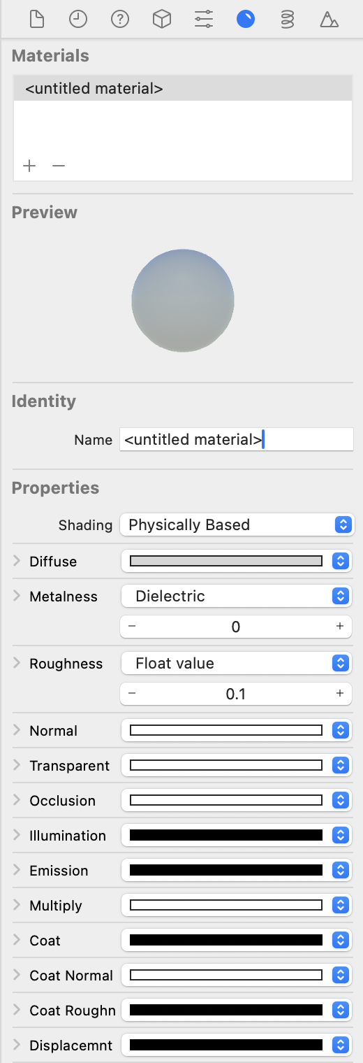 选中节点后,在观察器面板选择Materials inspector(材质观察器)。