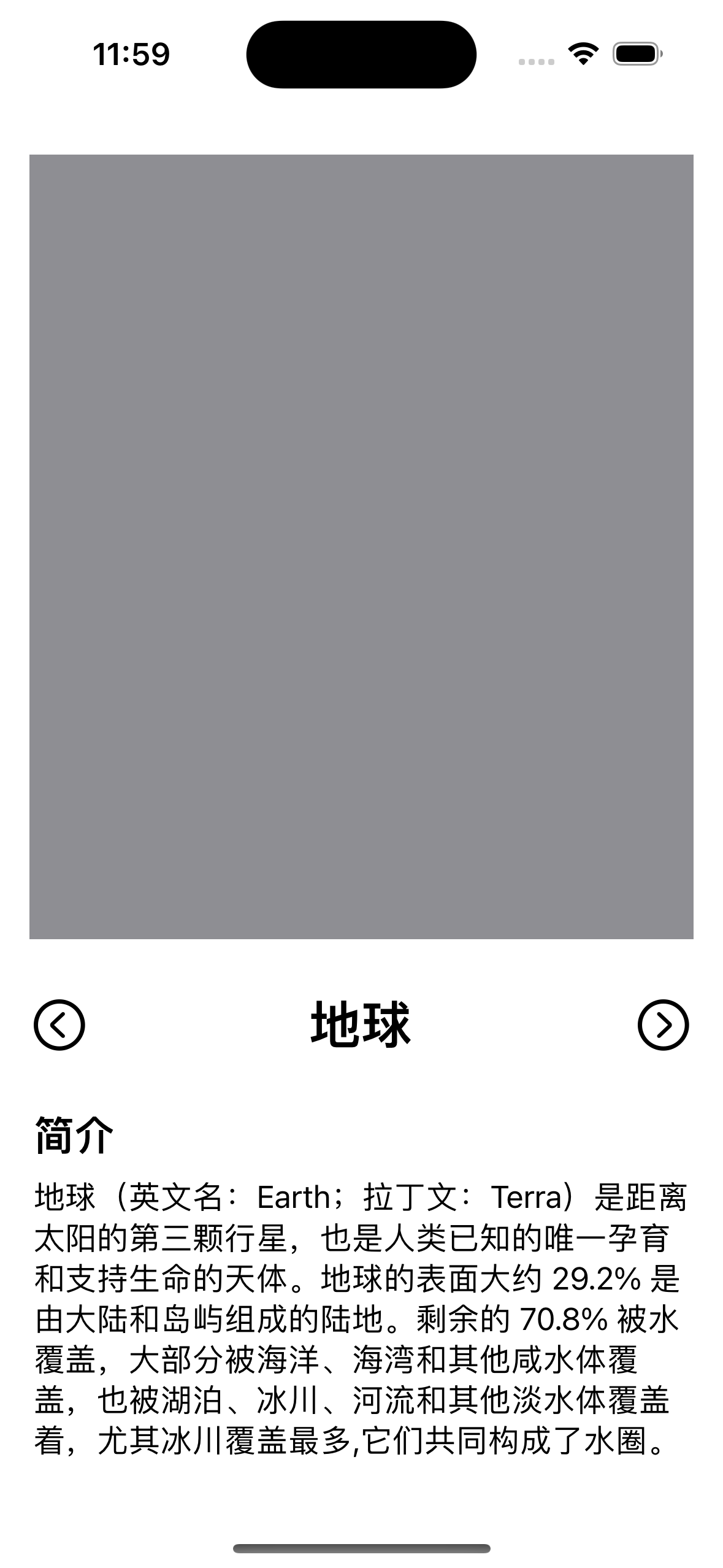 Text("地球(英文名:Earth;拉丁文:Terra)是距离太阳的第三颗行星,也是人类已知的唯一孕育和支持生命的天体。地球的表面大约 29.2% 是由大陆和岛屿组成的陆地。剩余的 70.8% 被水覆盖,大部分被海洋、海湾和其他咸水体覆盖,也被湖泊、冰川、河流和其他淡水体覆盖着,尤其冰川覆盖最多,它们共同构成了水圈。")