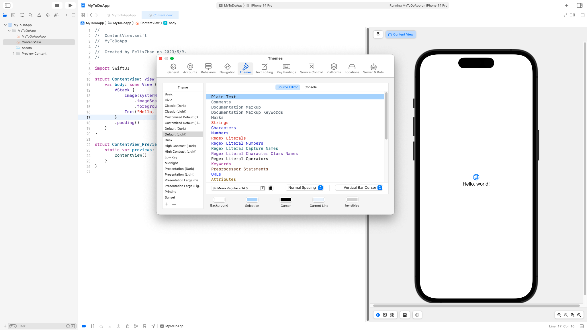 创建好项目之后,使用快捷 Command + , 或者顶部菜单栏的 Xcode→Settings 打开Xcode的偏好设置,在 Themes 主题选项部分可以选择或者设置代码编辑器的代码风格和字体大小: