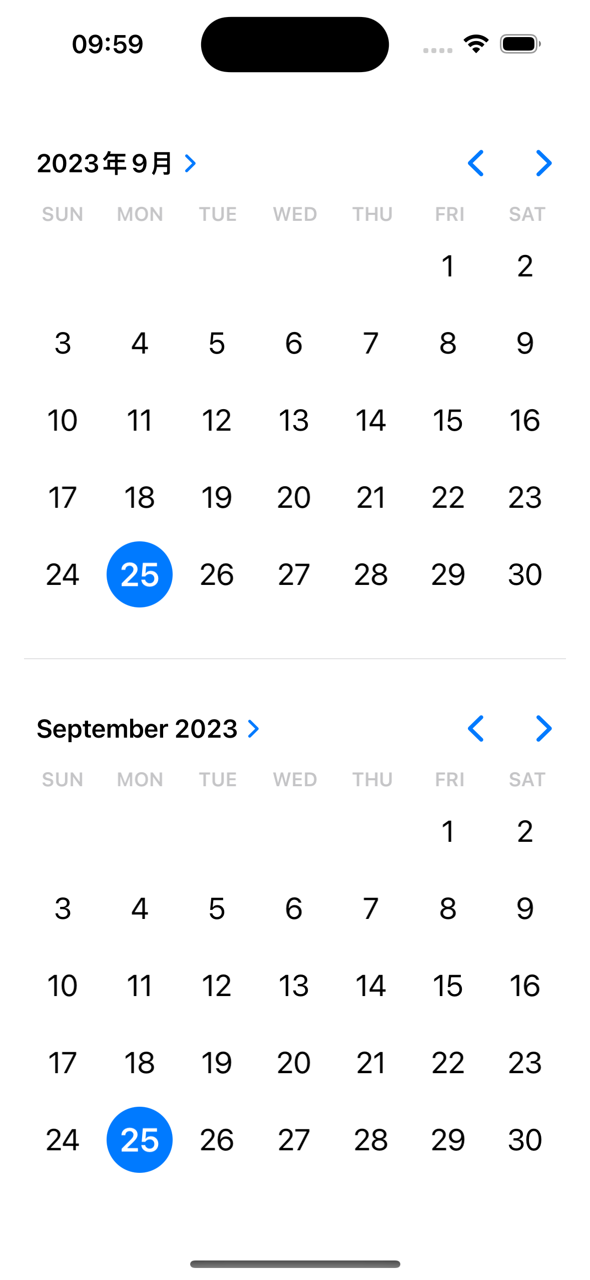 注意:在 Xcode 15.0 Beta中,并没有针对星期的显示进行本地化处理,无法确定是 Xcode 15.0 本身的问题还是最新的SwiftUI更新后的特性,在之前的的 Xcode 14.0中 本地化的处理也会对星期进行本地化,如下:
