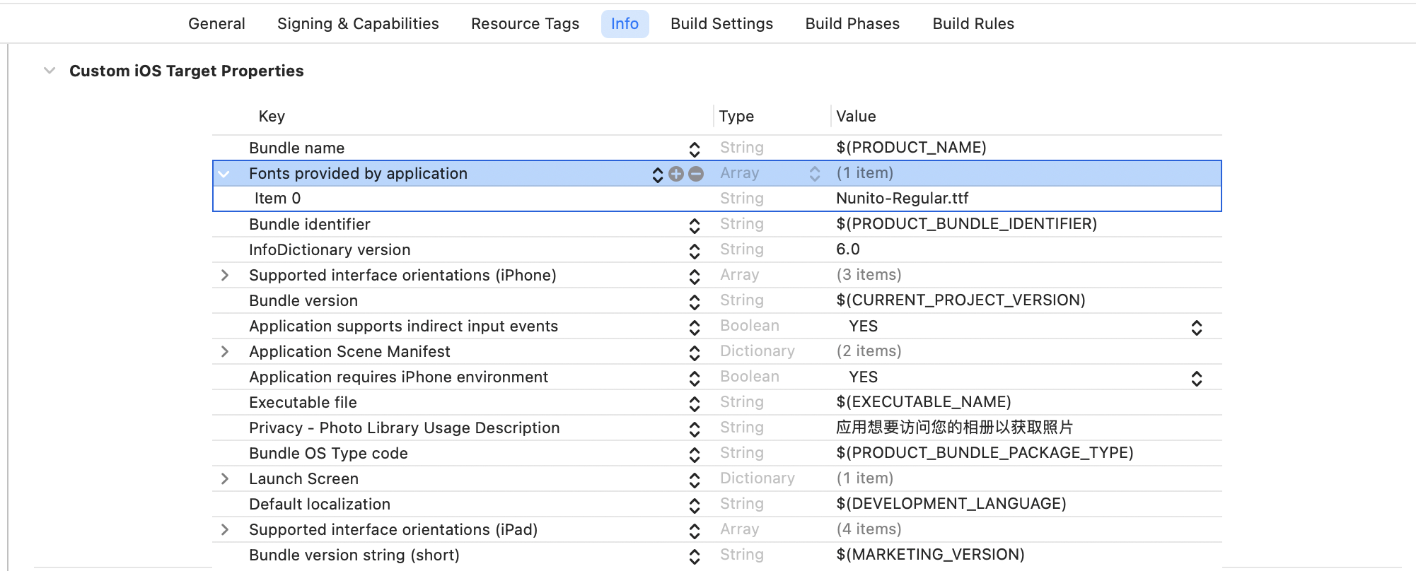 然后在项目的Info配置选项的Custom iOS Target Properties中添加字体的配置项,如下: