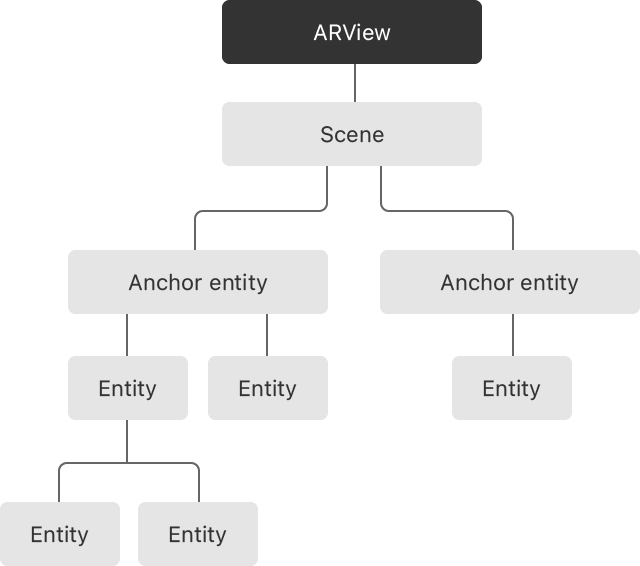 在RealityKit中,最上层是一个ARView,用来向用户展示一个渲染的 3D 图形。一个ARView都有一个单一的Scene,这是一个Entity集合的容器。在Scene上,我们可以添加一个或者多个AnchorEntity,这个实例可以让 ARView知道如何将内容显示在真实的世界中。对于每一个AnchorEntity,我们可以在上面添加多个和多层次的Entity用来构建场景内容。